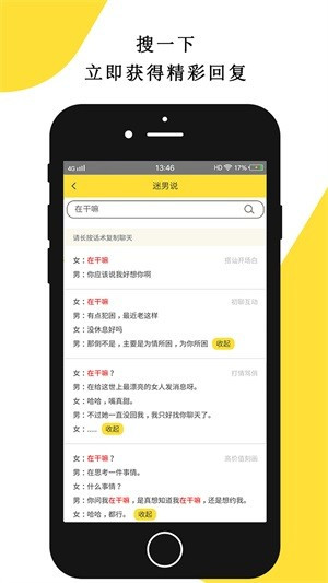 1、豐富話術(shù)迷男說app內(nèi)置20W+聊天話術(shù),你根本不需要去學(xué)習(xí)聊天!遇到不知道怎么回復(fù)時(shí)搜一下,N+精彩回復(fù)供您選擇。