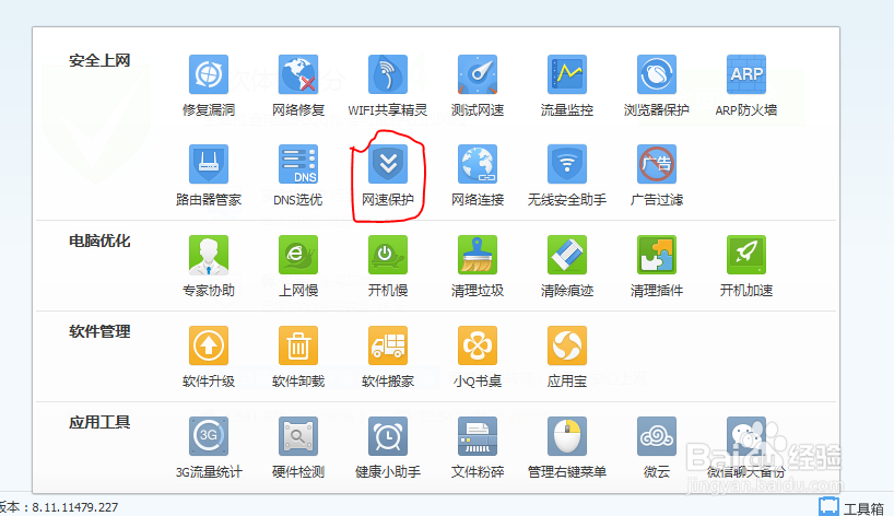 在“工具箱”界面下,點(diǎn)擊“網(wǎng)速保護(hù)”選項(xiàng)。(如圖所示)