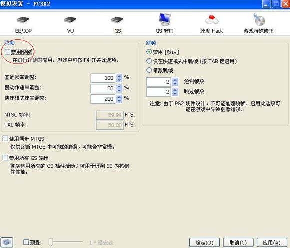 下面關(guān)鍵 模擬器設(shè)置方法第一步:點(diǎn)單機(jī)配置 模擬設(shè)置GS里面的限制幀率 默認(rèn)沒有打勾 也就是說現(xiàn)在處于限制幀率狀態(tài) 高配的玩家?guī)蕰?dǎo)致過高 所有默認(rèn)即可 低配的玩家跑不到滿60FPS 所以可以打勾 不限制 盡量以最快的速度模擬器(因?yàn)槟惚旧砼渲镁偷团懿坏?0FPS)