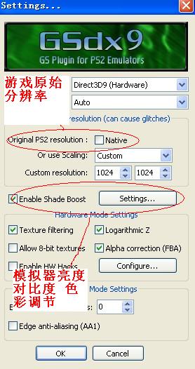 視頻(GS)(V)插件設(shè)置默認(rèn)為原始分辨率(模擬ZERO要用這個分辨率 兼容性高)如果你的配置夠高想提高游戲畫面 取消原始分辨率的勾 自己調(diào)節(jié)一下分辨率就可以了 這個我就不舉例子了每個人的配置都不同 之后點(diǎn)OK 低配玩家如果實(shí)在是卡的話那就把分辨率調(diào)到最低 256乘256 畫面雖然損失了 但會提高速度 看你要什么了