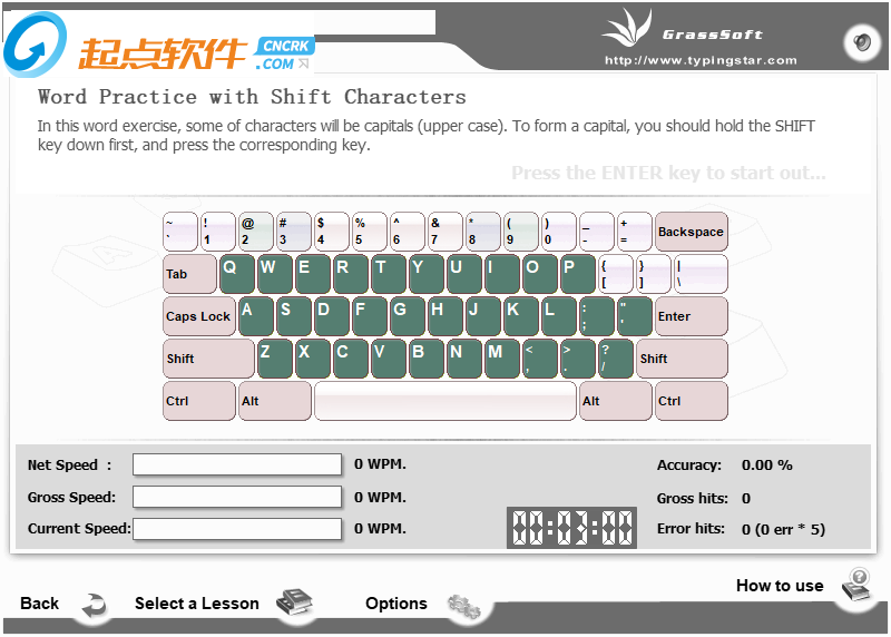 9、這里就是打字界面,可以在左邊找到你需要學(xué)習(xí)的功能,點(diǎn)擊一個(gè)功能進(jìn)入選擇界面