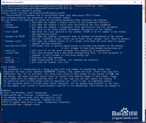 在命令行窗口,輸入TranslucentTB.exe --help可以看到更多的命令介紹,這里可以用tab鍵補(bǔ)齊,啟動(dòng)命令直接輸入TranslucentTB.exe --startup即可