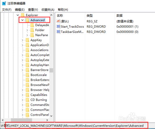 打開注冊(cè)表編輯器頁面之后,我們就可以依次雙擊打開左側(cè)的菜單欄目,將注冊(cè)表項(xiàng)定位至:HKEY_LOCAL_MACHINE\SOFTWARE\Microsoft\Windows\CurrentVersion\Explorer\Advanced
