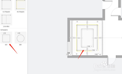 進(jìn)入自定義頂面界面,我們選擇矩形,按客廳位置框出吊頂位置,一定記得個窗簾盒留200的距離,然后在中間再框選一次,如圖制作