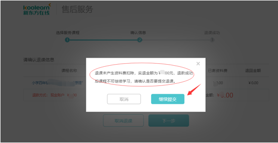 4.確定之后點擊下一步,會進行退課提醒,確認好之后提交后金額會在3個工作日內返回原支付渠道