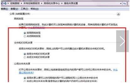 把“網(wǎng)絡(luò)發(fā)現(xiàn)”、“文件和打印機(jī)共享”、“公用文件夾共享”都設(shè)為啟用。