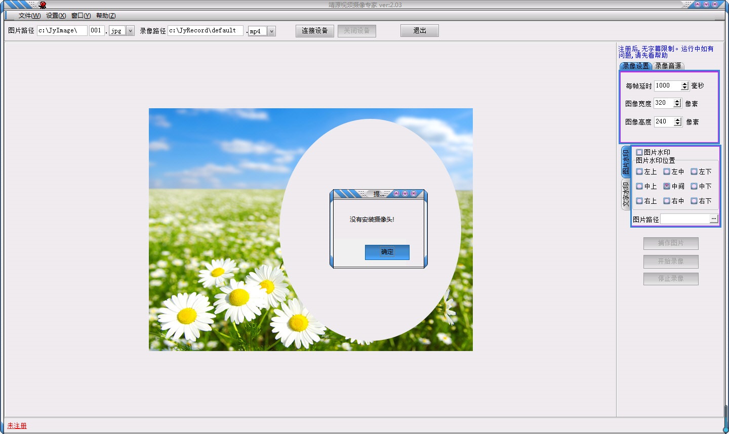 1、對(duì)攝像頭捕捉到的視頻,進(jìn)行錄像、捕捉單幅圖片。2、圖片支持jpg/bmp格式,錄像支持mp4/avi/flv/swf格式,錄音支持mp3/wav。