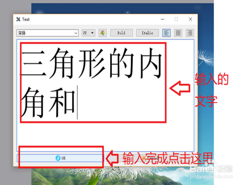 點(diǎn)擊文字按鈕添加文字。文字可調(diào)整大小,文字樣式以及顏色等。編輯好文字按”ok“確認(rèn)。確認(rèn)之后,調(diào)整文字位置,滿意之后鼠標(biāo)右擊”K“進(jìn)行固定。如圖