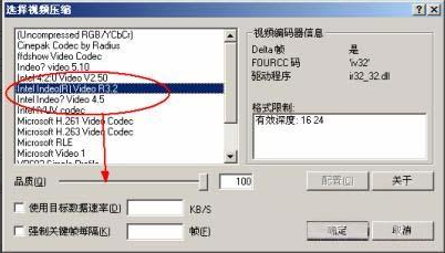 這時,VirtualDub會自動調(diào)出壓縮選項設置框,用戶可以在左邊的選擇框中選擇自己需要的視頻格式實現(xiàn)保存轉(zhuǎn)換,在選擇好格式以后,還可以拉動下方的滑動條來設置轉(zhuǎn)換后視頻的圖像聲音質(zhì)量壓縮文件格式