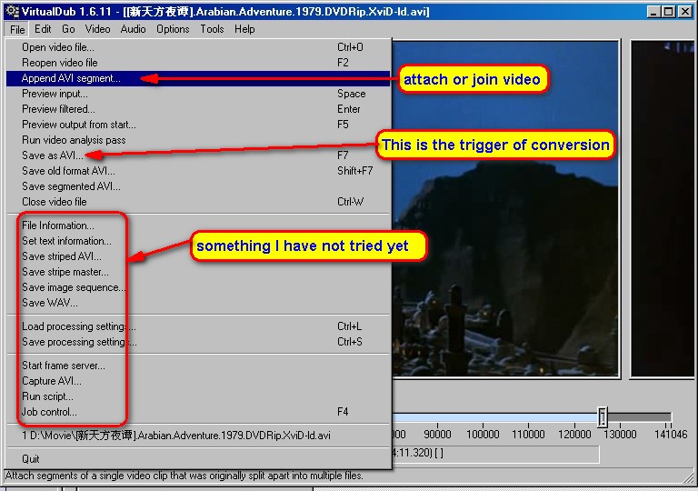 然后file->append .avi segment,有多少弄多少,不知道能否一次加完。但是加入后,就可以拖動slider在預覽里看到附加的片段了。
