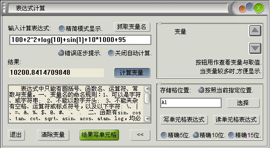 表達(dá)式計(jì)算精靈,又名表達(dá)式計(jì)算工具箱.能與excel智能交互操作與表達(dá)式相互傳遞。當(dāng)輸入表達(dá)式時(shí),能邊錄入或修改即時(shí)自動(dòng)輸出結(jié)果顯示。輸出結(jié)果準(zhǔn)確率達(dá)100%,完全符合各種即時(shí)計(jì)算與實(shí)際應(yīng)用需求。數(shù)據(jù)精確度分為小數(shù)位5位與10位及15位三個(gè)級(jí)別,計(jì)算結(jié)果及精度與excel計(jì)算的結(jié)果完全相一致。本工具箱支持常用與復(fù)雜的表達(dá)式計(jì)算,它包括算術(shù)計(jì)算、數(shù)值處理、三角函數(shù)及指變量與賦值運(yùn)行模塊,可綜合性的計(jì)算各種多層嵌套、復(fù)雜的函數(shù)表達(dá)式。你只要象在紙上列表達(dá)式一樣列出符合要求的運(yùn)算式,就立即可以看到即時(shí)運(yùn)算結(jié)果,可廣泛應(yīng)用于辦公、學(xué)習(xí)及需要使用計(jì)算器進(jìn)行復(fù)雜計(jì)算的各個(gè)領(lǐng)域,并且擁有4款漂亮的皮膚界面,其功能更可與excel運(yùn)算融為一體。