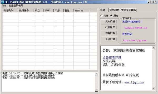 QQ微博管家輔助是一款QQ微博輔助工具。QQ微博管家輔助一鍵發(fā)布微博廣播、批量秒聽用戶,QQ微博管家輔助一鍵轉(zhuǎn)播廣播、一鍵點評廣播。QQ微博管家輔助刷聽眾功能,從此,粉絲都是浮云。
