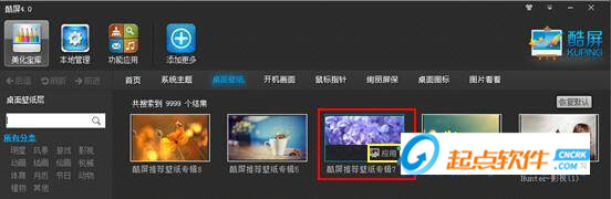 酷屏為您提供全部資源免費(fèi)下載,鼠標(biāo)點(diǎn)擊,桌面立即應(yīng)用。 3)一鍵恢復(fù)當(dāng)前使用的默認(rèn)資源 如果您使用了當(dāng)前資源不是很滿意,想恢復(fù)到開(kāi)機(jī)使用時(shí)的資源,您可以點(diǎn)擊“恢復(fù)默認(rèn)”按鈕,桌面立即恢復(fù)回到當(dāng)前使用的資源