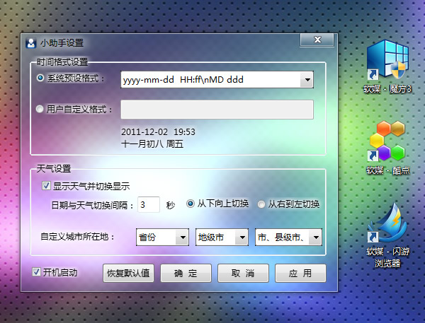 魔方小助手是軟媒出品的一個(gè)很有趣的電腦工具,極具創(chuàng)意的是它的開發(fā)技術(shù),直接監(jiān)管了Windows右下角的時(shí)間區(qū)域,是個(gè)非常有創(chuàng)新意義的小軟件。魔方小助手對(duì)CPU基本上是零占用,而且提供了天氣動(dòng)畫選項(xiàng),可以切換時(shí)間和天氣,一切都由您控制,鼠標(biāo)懸浮在時(shí)間那兒,還會(huì)有大提示窗口,很人性化,同時(shí)支持語音報(bào)時(shí),語音播報(bào)天氣。