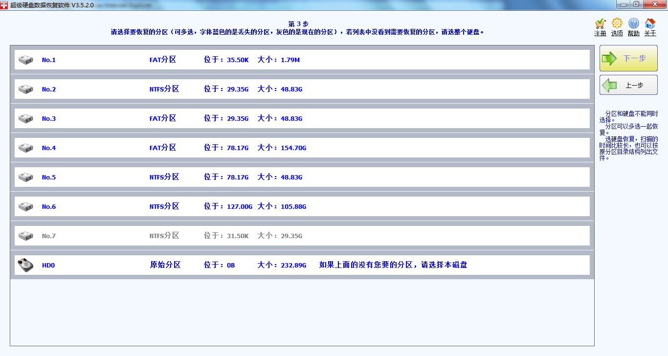 超級硬盤數(shù)據(jù)恢復(fù)軟件可以對任何一個無分區(qū)或者分區(qū)表損壞或者重新分區(qū)過的硬盤,能在幾分鐘內(nèi)對全盤進(jìn)行閃電掃描分區(qū)信息,列出全部分區(qū) 進(jìn)行恢復(fù)。掃描到的分區(qū)能夠和當(dāng)前正常的分區(qū)區(qū)分開并以藍(lán)色粗體高亮提示,閃電掃描分區(qū)的算法能夠?qū)BR分區(qū)表和GPT分區(qū)表同時掃描,比別的恢復(fù)工具 節(jié)省很多時間。