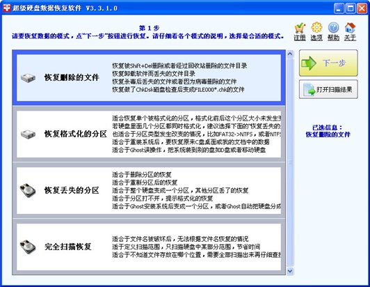 2、選擇恢復(fù)模式,其提供了恢復(fù)刪除的文件、恢復(fù)格式化的分區(qū)、恢復(fù)丟失的分區(qū)等多種不同的類型,用戶可以根據(jù)自己的恢復(fù)類型來選擇相應(yīng)的恢復(fù)模式(選擇恢復(fù)類型可參考模式右側(cè)的信息),選擇后點擊【下一步】繼續(xù)。