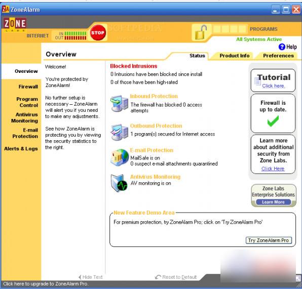 ZoneAlarm又叫ZA防火墻是一款老牌的防火墻產(chǎn)品,非常適合家庭個(gè)人用戶的使用,可以有效的保護(hù)計(jì)算機(jī)的安全免受病毒感染。該軟件能夠監(jiān)視來自網(wǎng)絡(luò)內(nèi)外的通訊情況,同時(shí)兼具危險(xiǎn)附件隔離、cookies保護(hù)和彈出式廣告條攔截等六大特色功能,能夠有效的預(yù)防電腦病毒。另外軟件本身帶有一個(gè)簡單的使用教程,可以幫助用戶快速上手。當(dāng)有程序想要存取Internet時(shí),如網(wǎng)絡(luò)瀏覽器可能會(huì)出現(xiàn)連不上網(wǎng)絡(luò),這時(shí)你可以通過ZA防火墻設(shè)置程序的上網(wǎng)權(quán)限,從而防止一些來路不明的軟件偷偷上網(wǎng)。