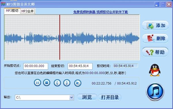 MP3剪切合并大師支持對MP3文件進(jìn)行任意時間段的切割,并且支持MP3, WMA, AMR, AAC,WAV, AVI, WMV, MOV, 3GP, MP4, FLV, RM, RMVB, VOB, DAT, MPEG, WAV, WMA, ASF以及大部分流行格式。MP3合并功能支持把多個MP3文件合并成一個文件。只需要將你的其他格式文件用MP3剪切合并大師打開,選擇好你想剪切的MP3起始位置和結(jié)束位置,點(diǎn)擊開始剪切按鈕,立刻搞定。MP3剪切合并大師支持對MP3文件進(jìn)行任意時間段的切割,并且支持MP3, WMA, AMR, AAC,WAV等大部分流行格式。