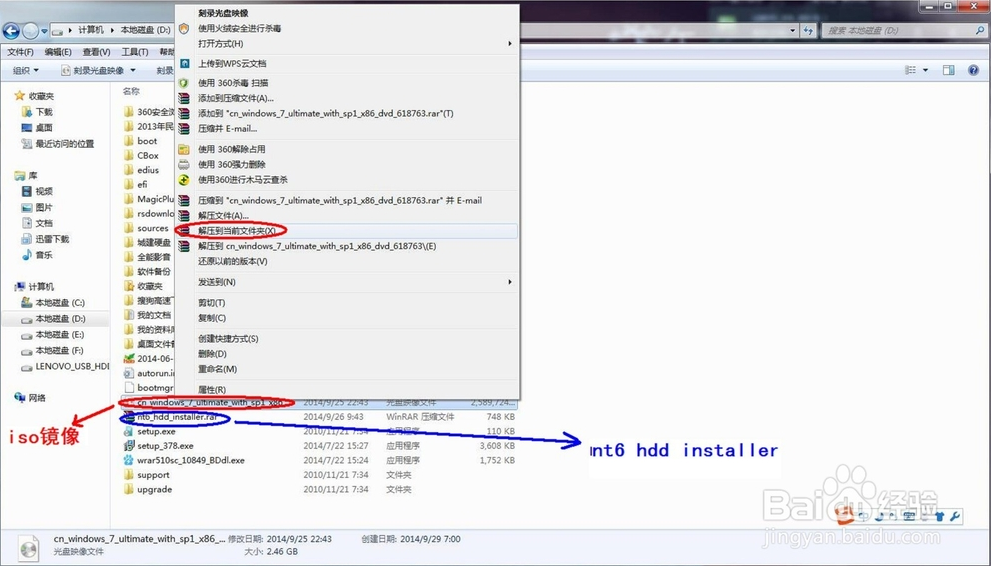 下載好之后,必須將win7的iso文件解壓到非系統(tǒng)盤(pán)符的根目錄,nt6 hdd installer要放到該盤(pán)的根目錄,與win7的解壓縮的所有文件放到一起。注意下圖,在下載好的iso文件上右擊,選擇“解壓到當(dāng)前文件夾”,不能選錯(cuò)??!同理,nt6 hdd installer也解壓到當(dāng)前文件夾,也就是當(dāng)前盤(pán)符根目錄。