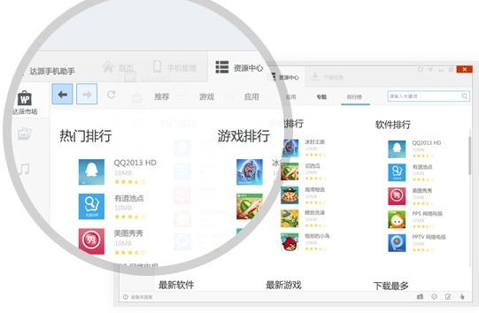 達派手機助手是史上最強大的win phone的手機助手。達派手機助手功能強大,支持多媒體導入導出,一鍵解鎖,云推送安裝應用,云端同步等功能,還有海量資源供用戶下載。達派手機助手是您個性化愛機的必備軟件。