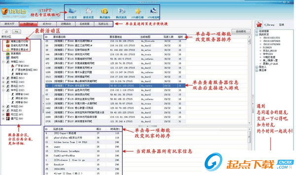 一、主界面(分區(qū)進(jìn)服、雙擊服務(wù)器直接進(jìn)行游戲)這里顯示的是登錄后的主界面,雙擊任何一臺服務(wù)器后,將直接進(jìn)入該服務(wù)器中游戲。省卻了進(jìn)入CS的一系列瑣碎操作.其他貼心的服務(wù)(如:分區(qū)進(jìn)F,選擇更適合您的服務(wù)器,在線客服幫助)等等功能,接下來一一介紹。