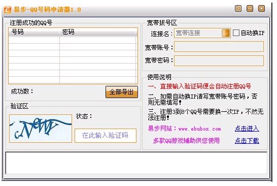 一、直接輸入驗證碼便會自動注冊qq號! 二、如需自動換ip請寫寬帶賬號密碼,否則無需填寫! 三、注冊3到8個qq號需要換一次ip,不然無法注冊!
