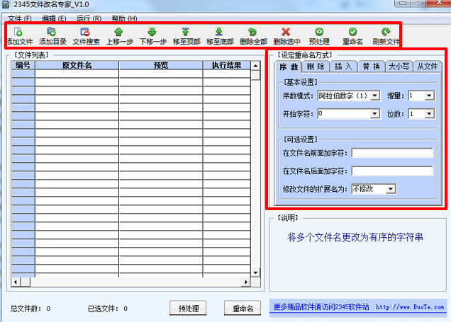 2345文件改名專家是2345軟件大全開發(fā)的一款功能強(qiáng)大的批量文件改名工具,可以把所有的文件快速方便的重命名;支持所有格式;支持預(yù)處理(即改名預(yù)覽);支持文件屬性更改。