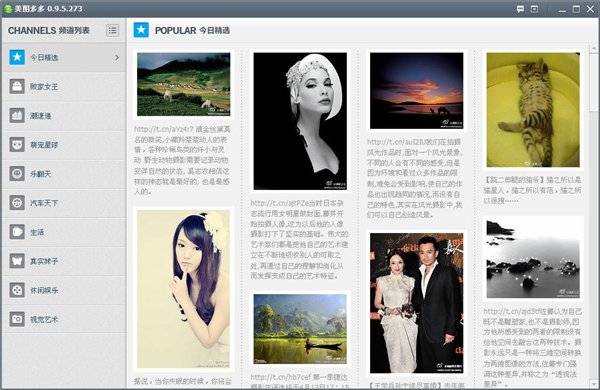 美圖多多極富個性的雜志式圖片資訊內容,方便我們不用開網(wǎng)頁即可將最熱門的網(wǎng)絡美圖一網(wǎng)打盡;同時,美圖多多針對不同用戶的圖片瀏覽喜好,在軟件左方有豐富的內容分類。左方的圖片分類就像一個個的閱讀頻道,又象是一本雜志的目錄,點擊翻看很有感覺;右方帶文字信息的網(wǎng)絡美圖點擊即可進入詳情瀏覽窗口。