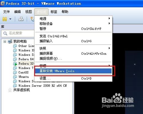 首先,進(jìn)入虛擬機(jī)系統(tǒng)之后,點(diǎn)擊虛擬機(jī)工具欄中的“虛擬機(jī)”,并選擇“重新安裝 VMware Tools”。