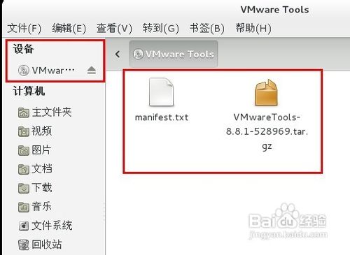 然后我們在光盤驅(qū)動器中便可以看到VMtools字樣了,點(diǎn)擊打開,找到VMtools安裝包,在linux操作系統(tǒng)下后綴名為tar.gz,我們可以直接解壓縮(有些linux系統(tǒng)支持,例如小編使用的fedora),也可以使用終端命令進(jìn)行解壓縮。