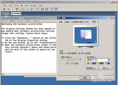 然后跳出了配置“硬件加速”的顯示屬性窗口和配置過程的文擋。具體界面如下圖:可以上圖左邊文檔的步驟來把“硬件加速”設(shè)置成“完全” ,其實(shí)很簡單,只要點(diǎn)擊“顯示屬性—>設(shè)置”中的“高級” ,然后出現(xiàn)如下圖: