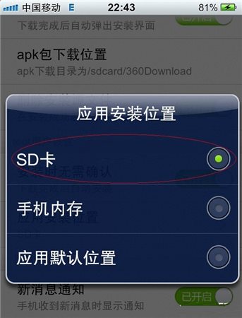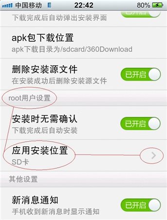 注:在手機(jī)中設(shè)置360手機(jī)助手安裝位置可能需要ROOT權(quán)限,否則可能無法進(jìn)入設(shè)置,如果無法設(shè)置,請確保您的手機(jī)已經(jīng)ROOT或者越獄。