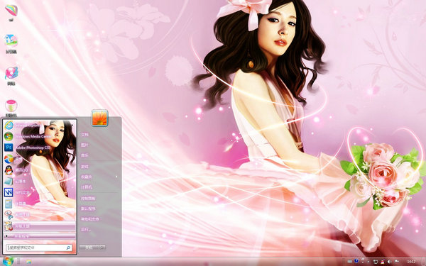 這款win7主題的桌面是一個穿著粉色婚紗的mm,頭上戴著大大的蝴蝶結(jié),手上捧著粉色的玫瑰花束,臉上洋溢著幸福的笑容,此情此景是不是非常容易打動人呢~