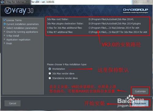 這一步需要設(shè)置vray3.0【vr3.0 for 3dmax2014】渲染器(64位)的安裝路徑和選擇VR3.0的安裝類(lèi)型,一般情況英文版的VR會(huì)自動(dòng)查找到相對(duì)應(yīng)的MAX的安裝程序,所以我們一般選擇保持默認(rèn),如果當(dāng)你發(fā)現(xiàn)安裝路徑不對(duì)時(shí),請(qǐng)點(diǎn)擊Customize自定義選擇安裝路徑,然后就可以點(diǎn)擊開(kāi)始安裝了
