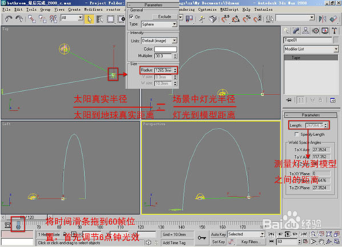 燈光軌跡確定之后,下面我們將以某一時(shí)刻為基準(zhǔn),來(lái)創(chuàng)建出場(chǎng)景的基本光照效果。本案例我們來(lái)以上午6點(diǎn)為基準(zhǔn)進(jìn)行操作。將時(shí)間滑塊拖動(dòng)到第60幀的位置。首先來(lái)確定燈光半徑值。通過(guò)在場(chǎng)景中測(cè)量得到燈光與模型之間的距離,而太陽(yáng)真實(shí)直徑和真實(shí)距離網(wǎng)絡(luò)查詢(xún)能夠得到,套用公式最終可以得到VRlight球形燈光的半徑。這個(gè)半徑值將在后面整個(gè)動(dòng)畫(huà)過(guò)程中保持固定不變。
