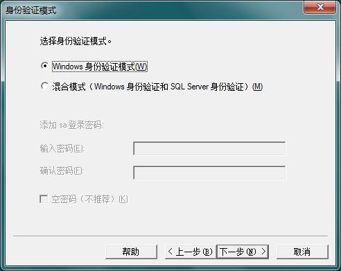 13.一般默認(rèn)選擇【W(wǎng)indows身份驗(yàn)證模式】。如果選擇【混合模式】,則需要輸入sa用戶(hù)訪(fǎng)問(wèn)sql server 數(shù)據(jù)庫(kù)的密碼,sa用戶(hù)是SQL SERVER 自動(dòng)添加的一個(gè)用戶(hù)。出于安全性考慮應(yīng)輸入密碼。單擊【下一步】