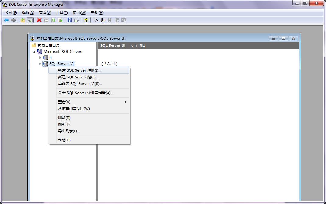3.再展開(kāi)后如果顯示無(wú)項(xiàng)目,可右擊新建SQL server 注冊(cè)