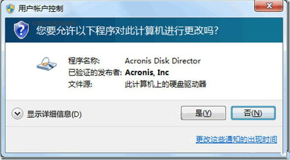 Acronis Disk Director 11 的安裝程序包是需要管理員權(quán)限的,初次運(yùn)行下載的原版安裝包 ADD11H_trial_en-US.exe 的時候,開啟著UAC的朋友們會遇到一個確認(rèn)對話框,點(diǎn)擊“是”即可。XP用戶和管理員權(quán)限登錄Vista/Win7的朋友是看不到這個對話框的。