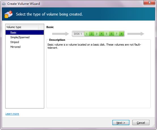 此實(shí)用的創(chuàng)建卷向?qū)б迅倪M(jìn),以支持動態(tài)卷的創(chuàng)建?,F(xiàn)在,除了基本卷以外,您還可以輕松地在 Acronis Disk Director 中創(chuàng)建動態(tài)卷,以便: