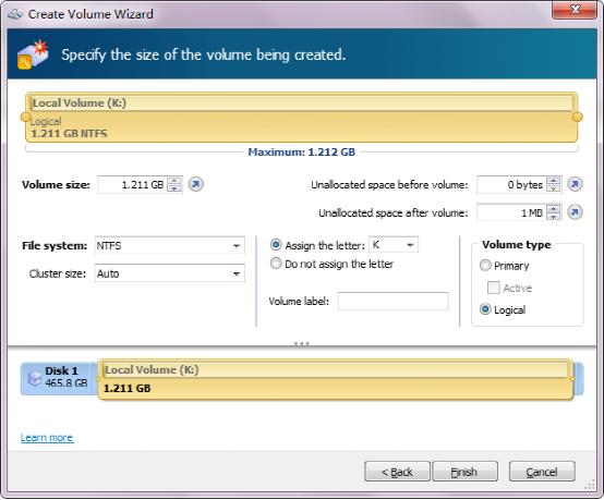 出現(xiàn)上圖界面,這里也可以通過拖動頂部長條調(diào)整分區(qū)大小。和前面一樣,Volume size就是你設(shè)置的分區(qū)大小,右邊Unallocated space before volume和Unallocated space after volume分別是說這個分區(qū)前面和后面要留下多少未分配空間,可能新手不知道為什么要有未分配空間。如果你要是想給別的分區(qū)空間,必須要先留未分配空間然后再把未分配空間給別的分區(qū),要是別的空間不調(diào)整,這里完全可以完全占據(jù)未分配空間。往下看,F(xiàn)ile system是分區(qū)類型,在windows下常用的就是FAT32和NTFS,也可以建立Linux下的各種類型分區(qū)。如果不懂的就默認(rèn)NTFS就行了。Cluster size分區(qū)的分塊大小,默認(rèn)Auto就行。Assign the letter是分配盤符,也可以選擇下面Do not assign the letter,只建分區(qū)不分配盤符。volume type是分區(qū)類型,Primary是指主分區(qū),Active是指活動分區(qū)。在現(xiàn)有的mbr分區(qū)表下,一個硬盤上最多有四個主分區(qū),只能 設(shè)一個活動分區(qū),只有主分區(qū)才能設(shè)置活動分區(qū),一般我們把C盤設(shè)置成主分區(qū)和活動分區(qū),如果C盤不是活動分區(qū),我們在C盤的系統(tǒng)就不能啟動了。Logical指邏輯分區(qū),一般的分區(qū)我們選擇這個就行了。完成之后點(diǎn)擊Finish。
