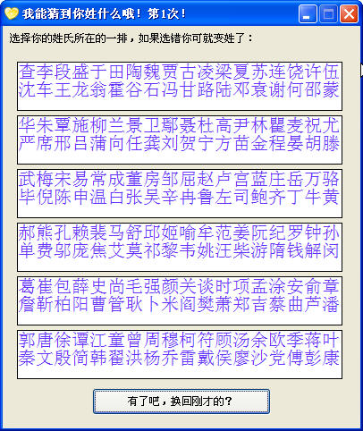 一款?yuàn)蕵?STRONG>猜姓軟件,測(cè)試當(dāng)娛樂就好了??! 36個(gè)姓的只需要猜兩次。。。 216個(gè)姓的也僅僅只需要3次哦。。。