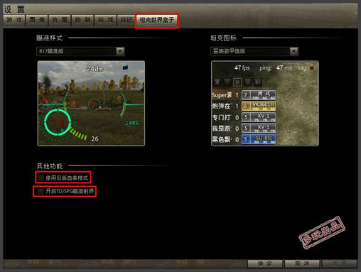 2,插件篇。坦克盒子,你需要一個(gè)。裝好盒子后,在增強(qiáng)包-雜項(xiàng)插件-小地圖插件科學(xué)量角器,這個(gè)必裝,它將在小地圖顯示坦克的射界和暴露之圈及500米極限視野。安裝盒子,并用盒子進(jìn)入游戲后,在車庫界面左上角有:盒子-坦克世界盒子-圖標(biāo)的下方,選擇巨響裝甲值版。然后是在:盒子-標(biāo)記中,標(biāo)記坦克圖標(biāo),其它自便。這樣你在戰(zhàn)斗中就可以看到周圍人員是什么車,其裝甲值是多少。