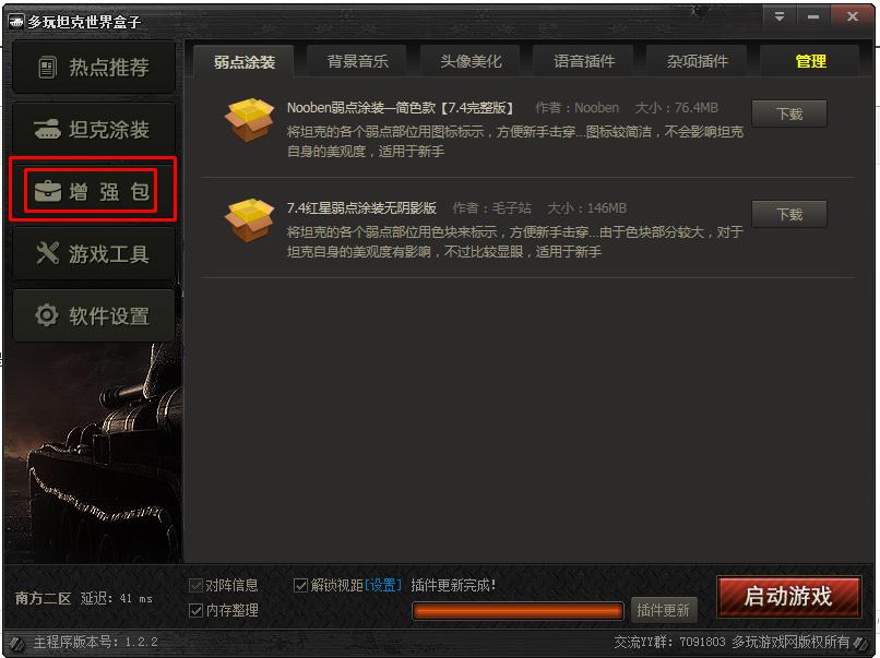6、弱點(diǎn)插件、語音包、車庫、車組成員頭像 后續(xù)會(huì)做成增強(qiáng)包的形式發(fā)布,因?yàn)椴糠治募^大,會(huì)對(duì)服務(wù)器下載造成負(fù)擔(dān),請(qǐng)大家諒解,或使用原版坦克世界工具箱下載