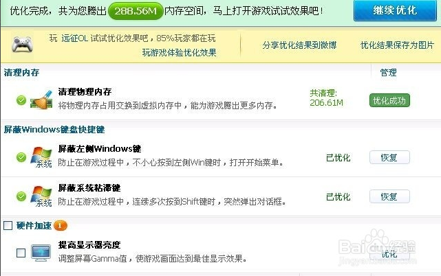 1.一鍵優(yōu)化1、清理內(nèi)存 2、屏蔽Windows鍵盤快捷鍵 3、硬件加速 4、關(guān)閉占內(nèi)存的程序