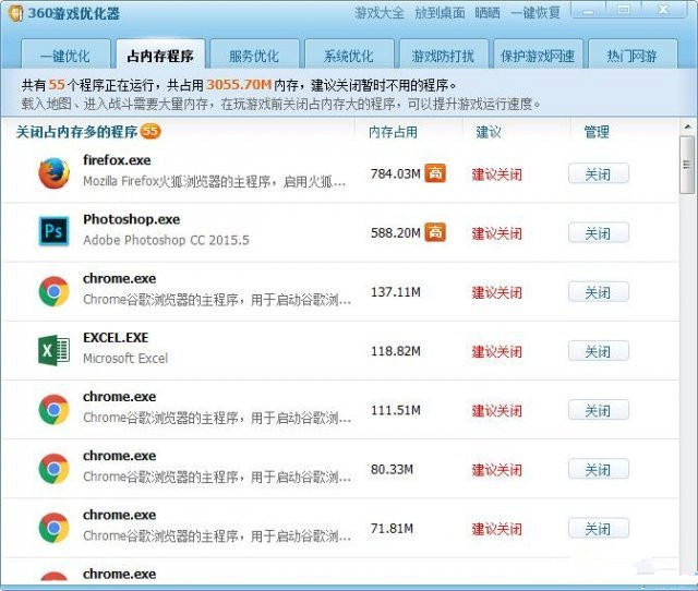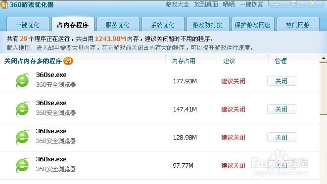 最后我們看看占內(nèi)存程序 看到了很多360瀏覽器 不用的 我們可以關(guān)閉幾個(gè) 已保持游戲的順暢