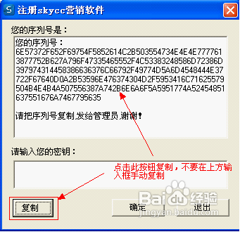 初次啟動時軟件會彈出密鑰植入窗口,點擊左下方的復制按鈕將序列號復制發(fā)給SKYCC客服人員(注意不要直接手動復制),然后將skycc客服人員回傳過來的軟件密鑰粘貼進去,點擊確定,顯示密鑰已植入。