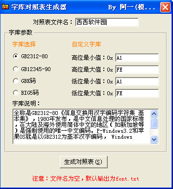 GB2312字庫對照表生成軟件 1.0綠色版 GB2312字庫對照表生成軟件全稱是GB2312-80《信息交換用漢字編碼字符集 基本集》,1980年發(fā)布,是中文信息處理的國家標(biāo)準(zhǔn),在大陸及海外使用簡體中文的地區(qū)(如新加坡等)是強制使用的唯一中文編碼。P-Windows3.2和蘋果OS就是以GB2312為基本漢字編碼, Windows 95/98則以GBK為基本漢字編碼、但兼容支持GB2312。