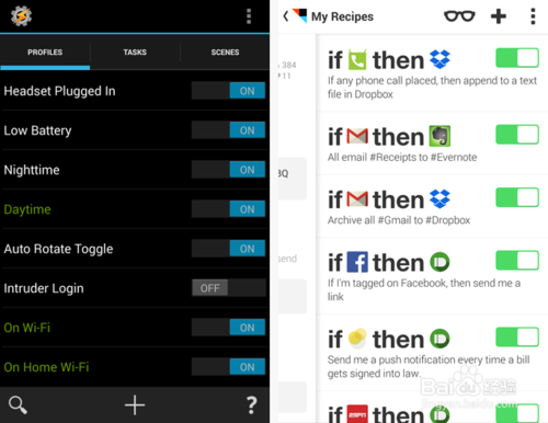 Tasker 的作用范圍非常非常廣泛,可以做的事情簡(jiǎn)直多到你無(wú)法想象!從日常生活到專業(yè)的工作輔助,只要是手機(jī)能做的事情,它基本都能用各種方法實(shí)現(xiàn)“自動(dòng)化”,你需要的只是腦洞跟一點(diǎn)點(diǎn)折騰精神。在 Tasker 里面,它的「自動(dòng)化任務(wù)」主要是由兩部分組成,一個(gè)是觸發(fā)條件,一個(gè)是執(zhí)行任務(wù),你只要配置好這兩個(gè)東西就能做出一套自動(dòng)化任務(wù)流程了。它就像是一個(gè)安卓本地版的 IFTTT,核心思想同樣也是「如果怎樣,那么就執(zhí)行什么」。