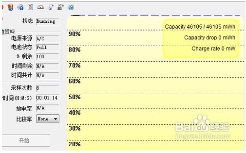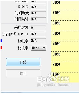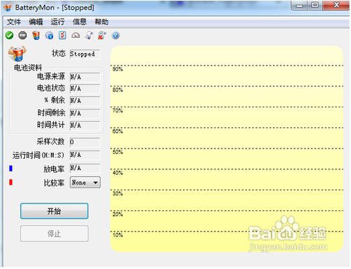 2、你會(huì)看到軟件的上面顯示“stopped”說(shuō)明軟件還沒(méi)有被運(yùn)行,點(diǎn)擊下面的“開(kāi)始”按鈕就開(kāi)始運(yùn)行軟件,你會(huì)看到你的電池目前的運(yùn)行狀況