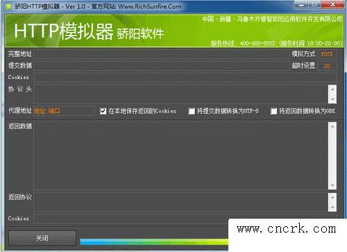 驕陽HTTP模擬器 1.0 官方綠色版 驕陽HTTP模擬器是一款網(wǎng)頁模擬器。驕陽網(wǎng)頁模擬器可以模擬瀏覽器客戶端對網(wǎng)頁進(jìn)行模擬提交,并且可以智能分析返回?cái)?shù)據(jù),是get與post開發(fā)的好幫手!
